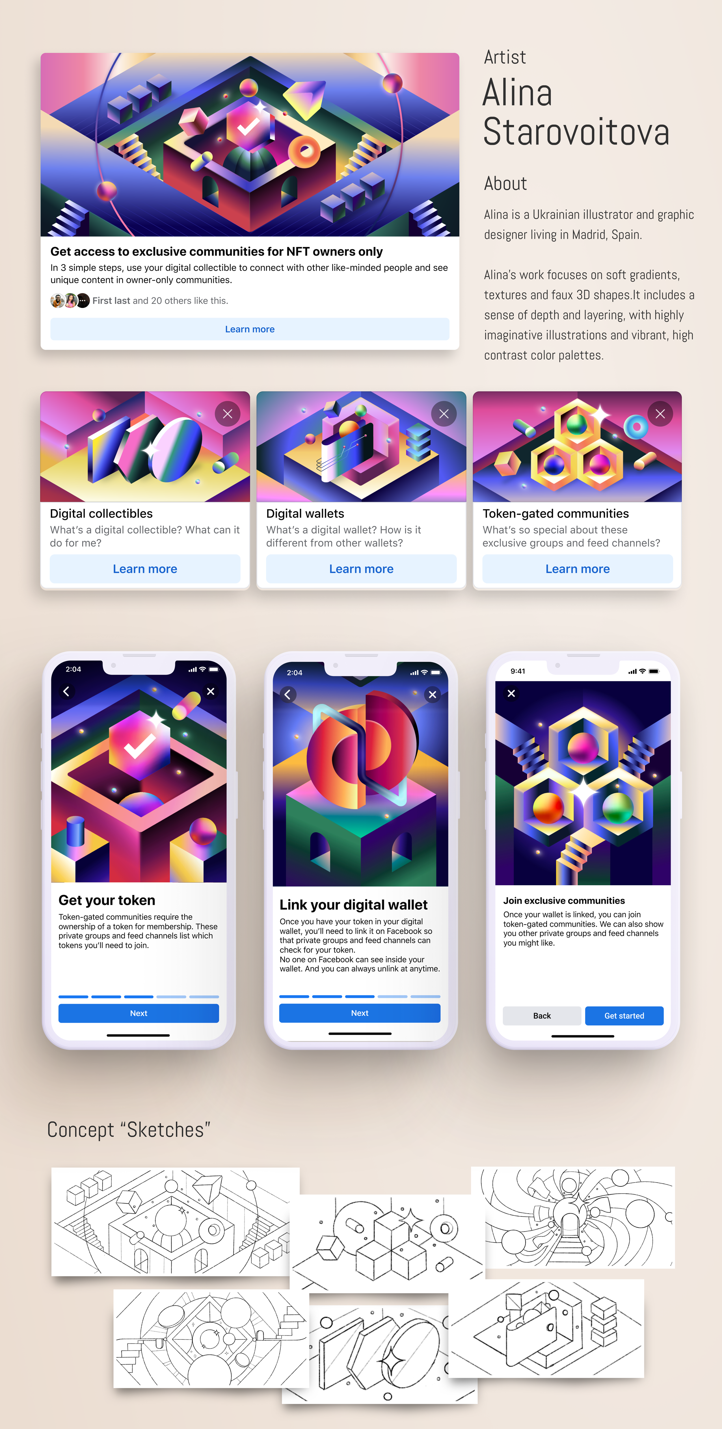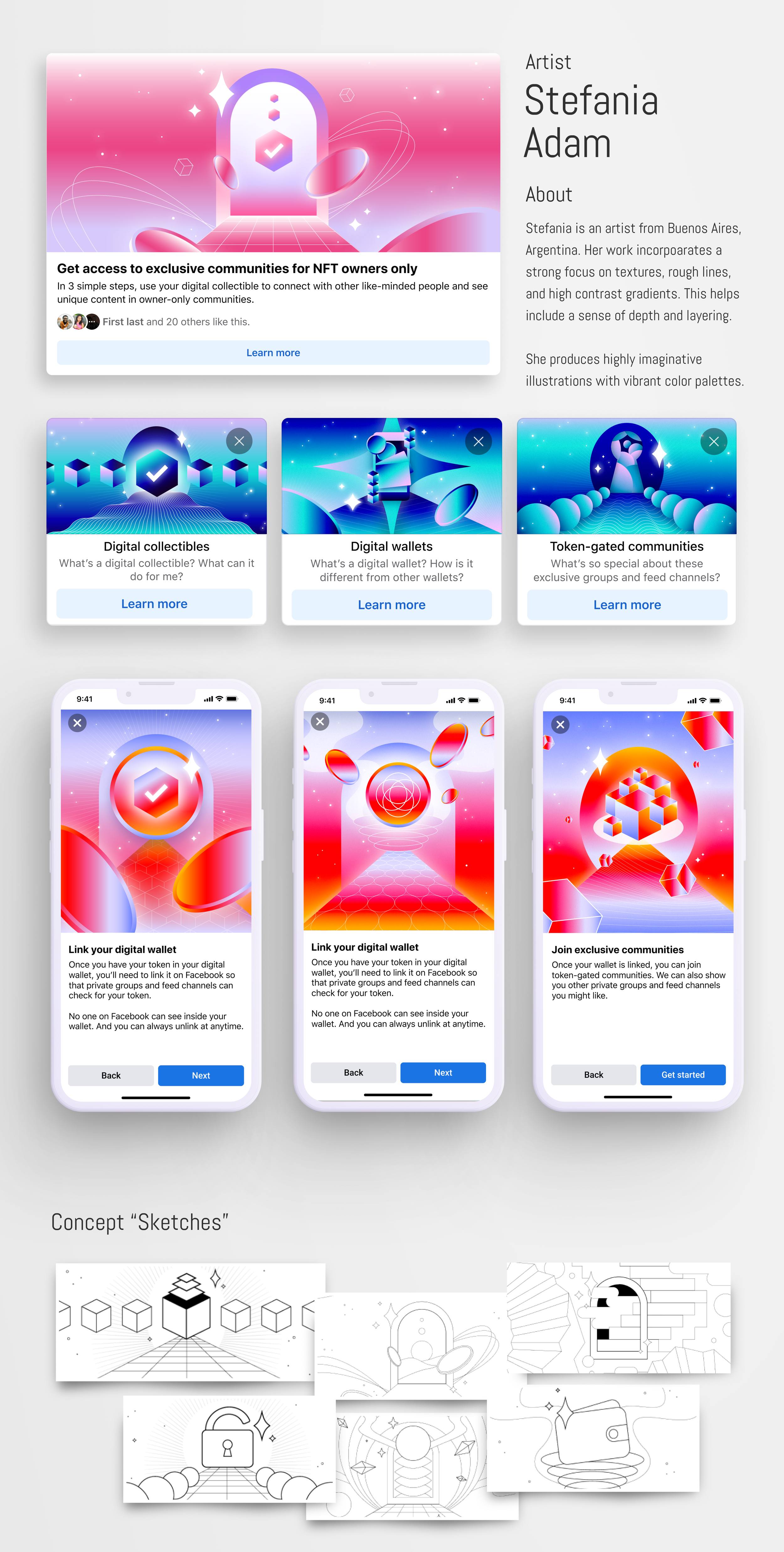 As Creative Lead, it was my responsibility to identify and manage strong artists partnerships. My focus was on promoting global creatives to tell their story in a unique way. I led the Artist Partnership Program which shaped the visual system for Facebook Events, Cultural Moments, and NFTs on the Facebook app. My creative direction then informed how Instagram and other Meta apps showed up.